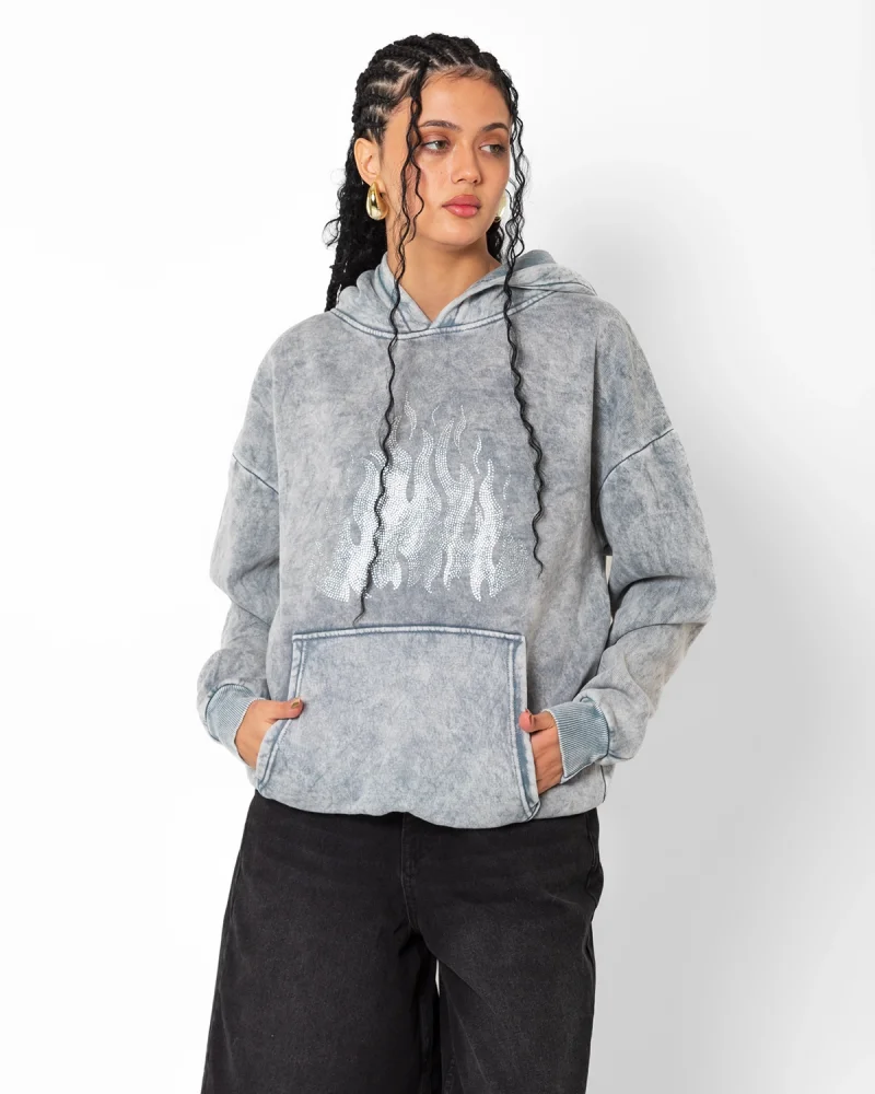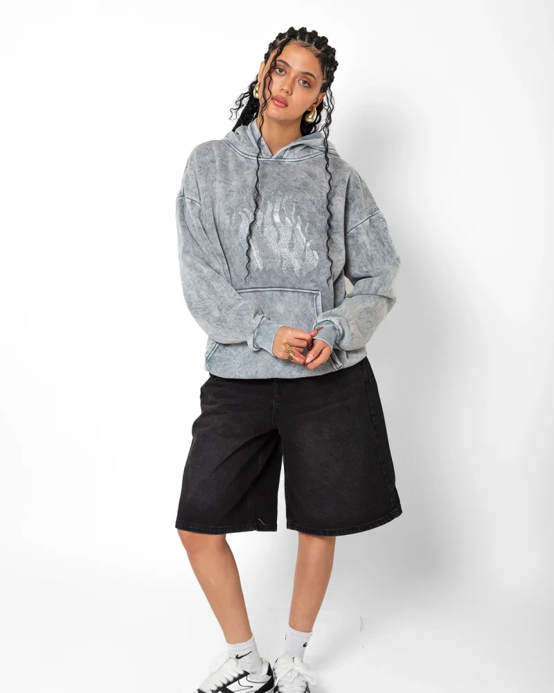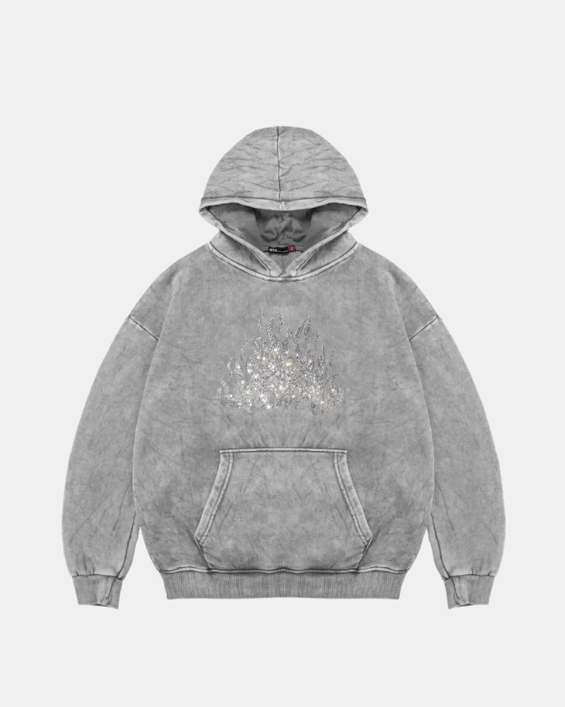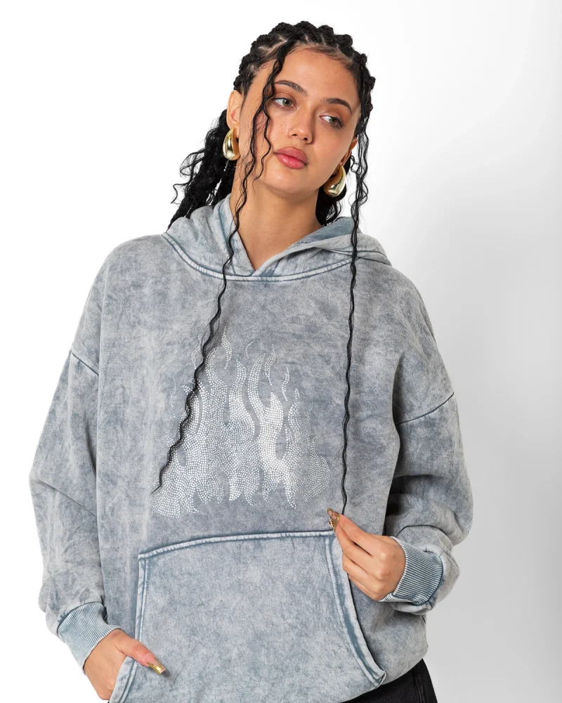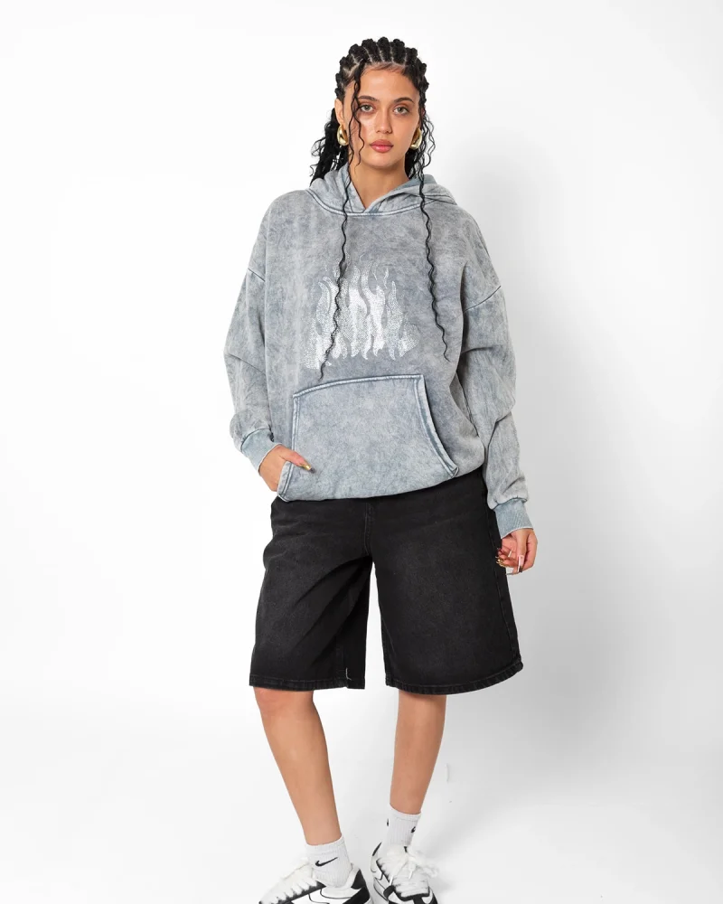 Flame Taş Baskılı Oversize Unisex Yıkamalı Siyah Hoodie