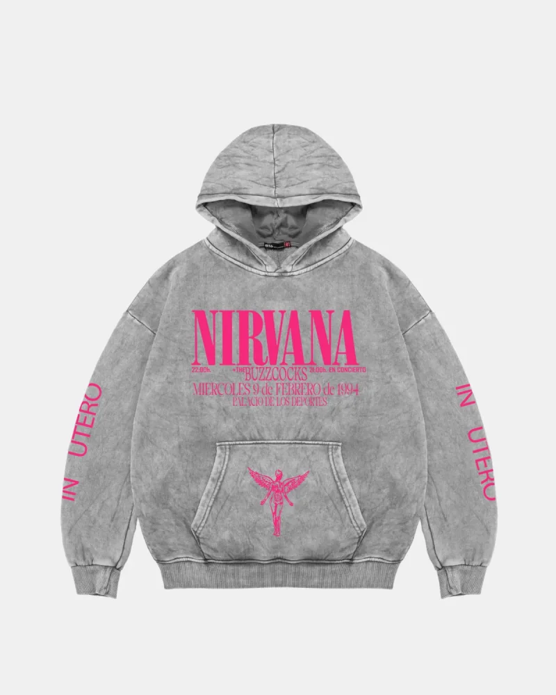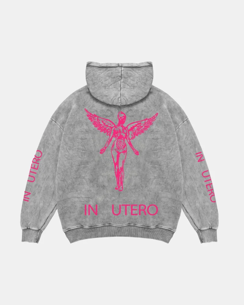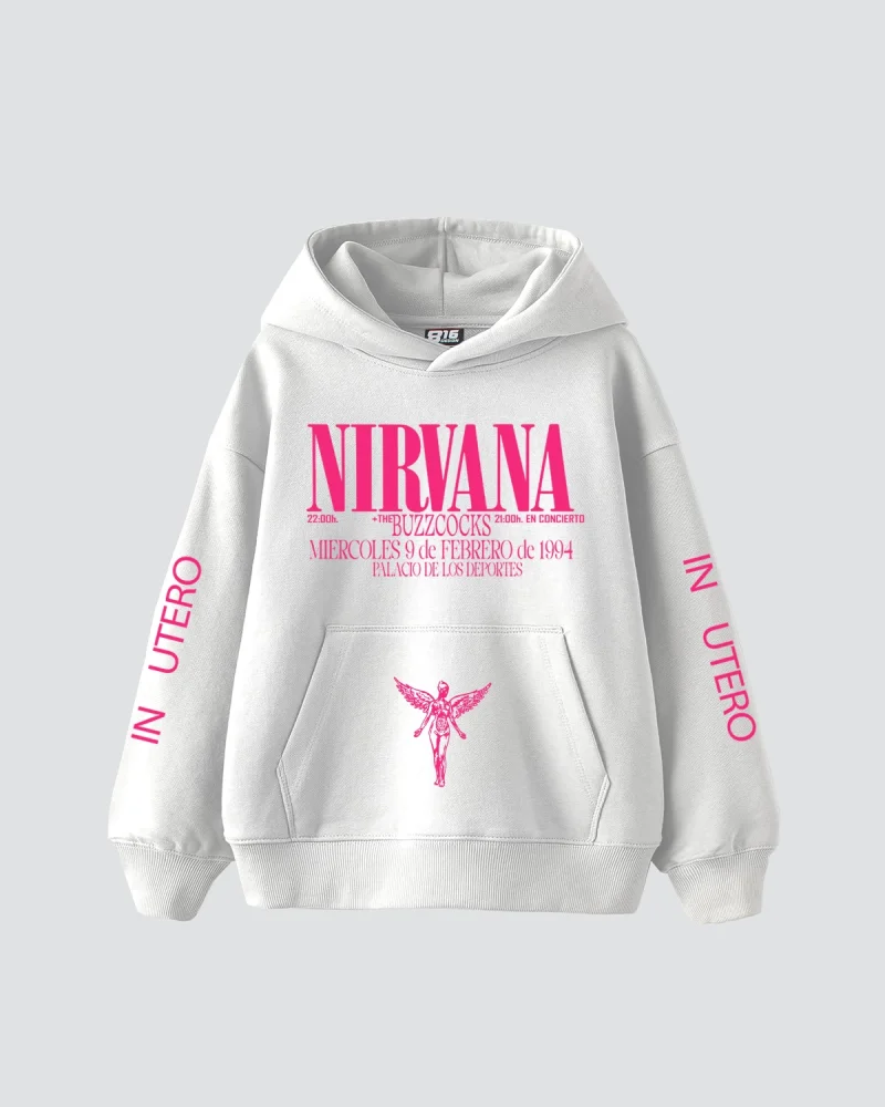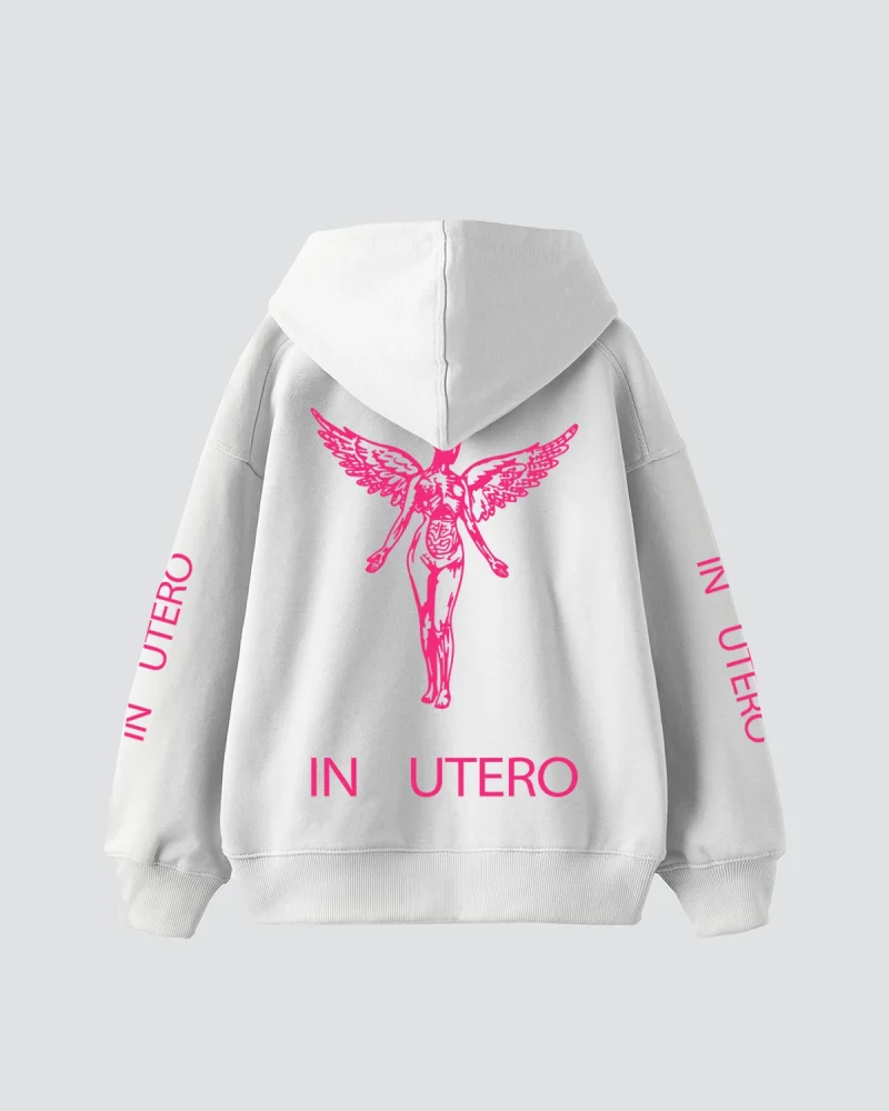 Nirvana In Utero Pembe Baskılı Oversize Unisex Yıkamalı Beyaz Hoodie