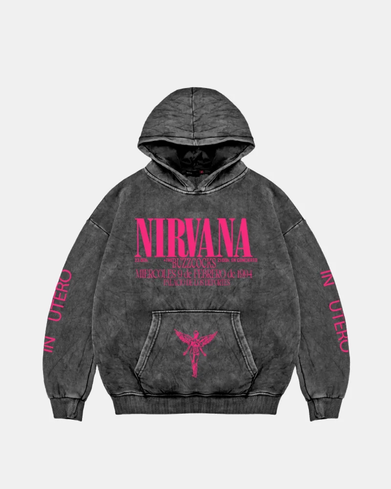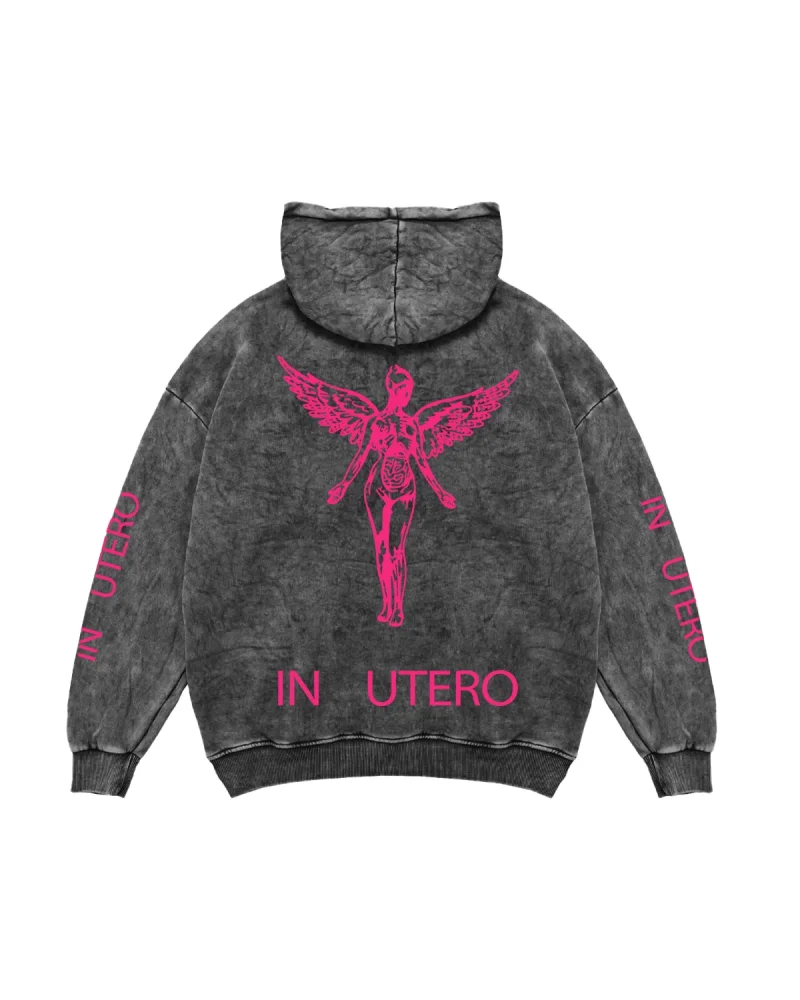 Nirvana In Utero Pembe Baskılı Oversize Unisex Yıkamalı Siyah Hoodie
