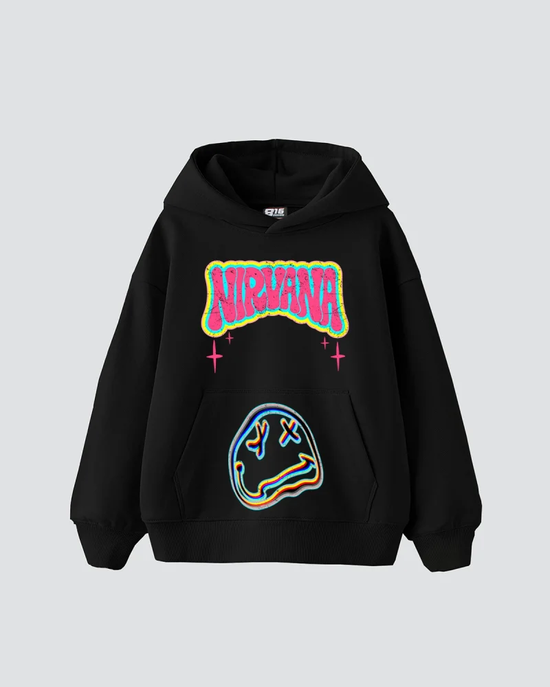 Nirvana Smile Baskılı Oversize Unisex Siyah Hoodie