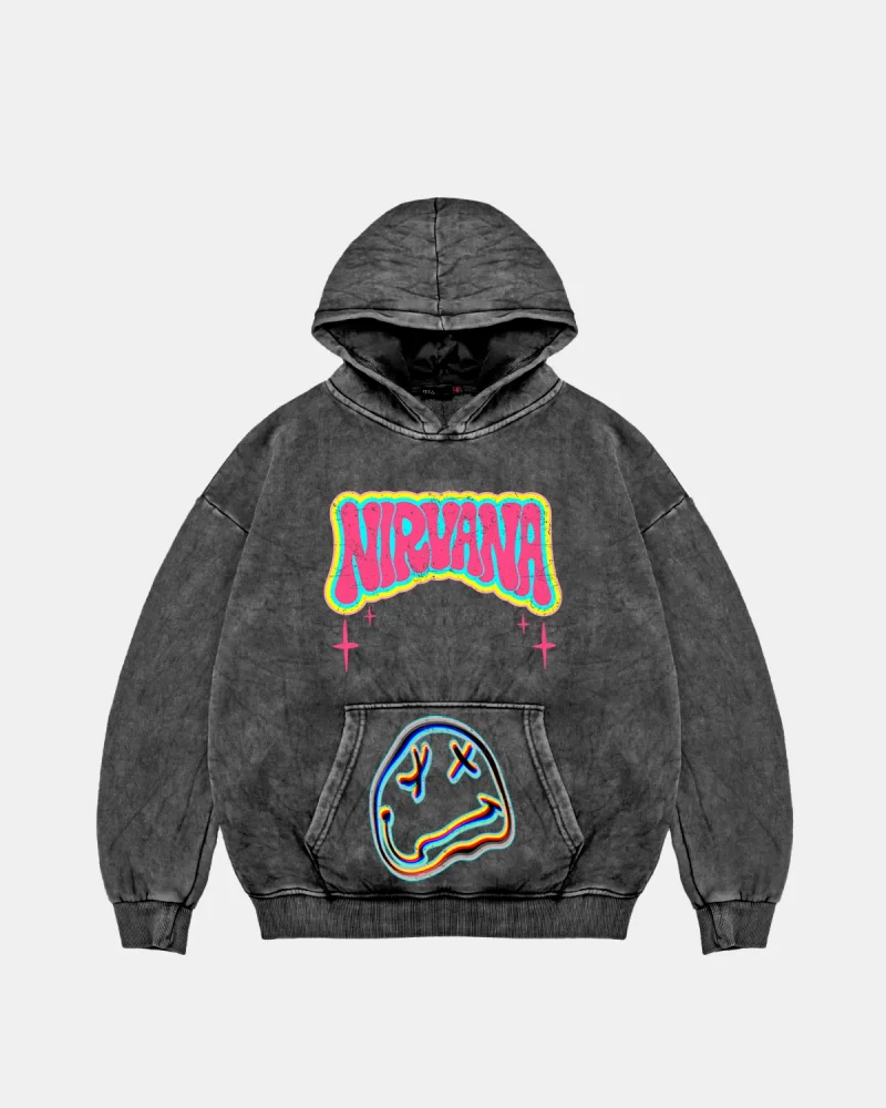Nirvana Smile Baskılı Oversize Unisex Yıkamalı Siyah Hoodie