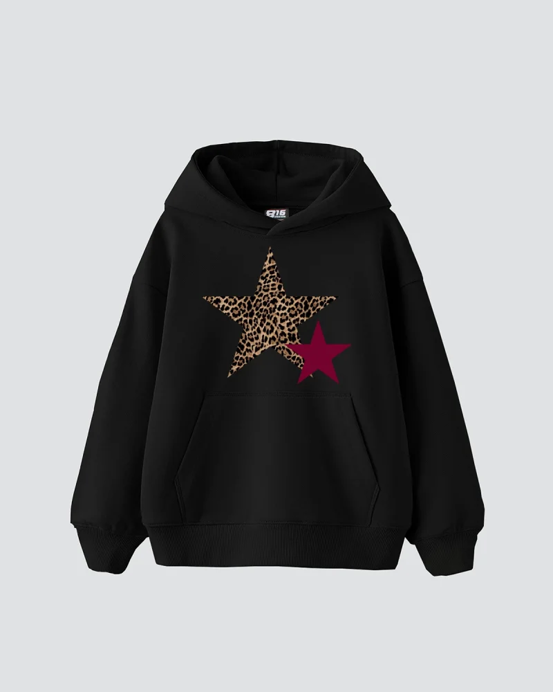Y2k Leopar Starz Baskılı Oversize Unisex Siyah Hoodie
