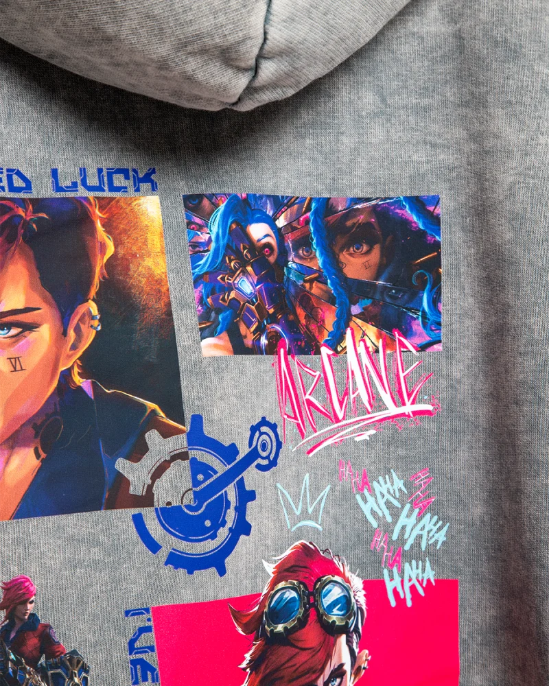 VI Arcane Baskılı Oversize Unisex Yıkamalı Beyaz Hoodie