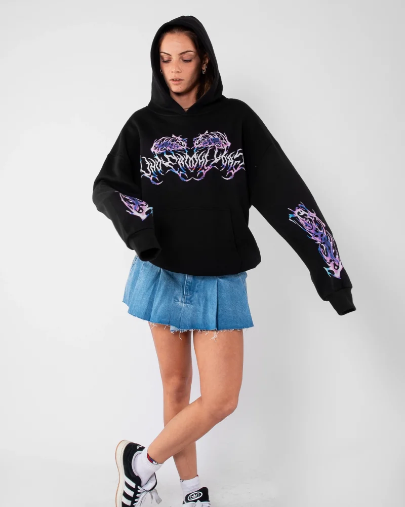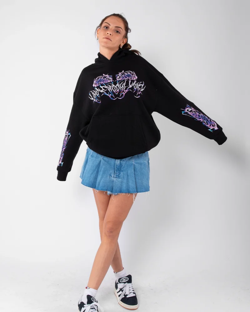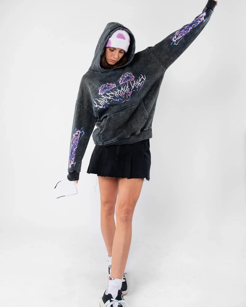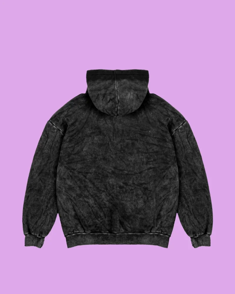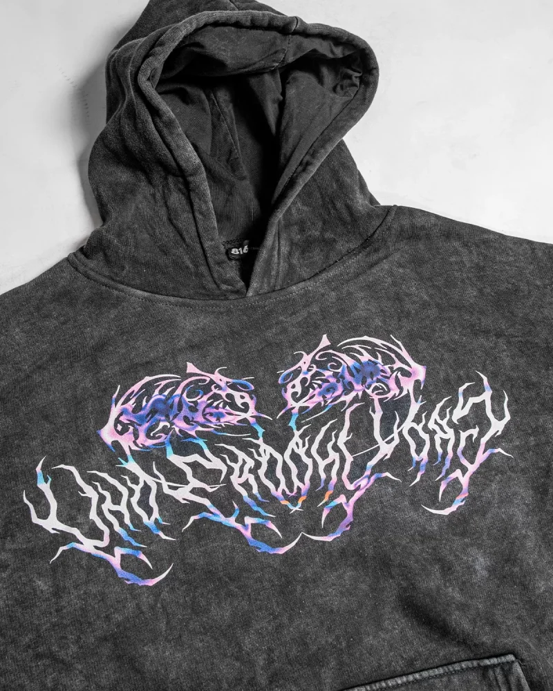Yıkamalı Korn Baskılı Oversize Unisex Siyah Hoodie
