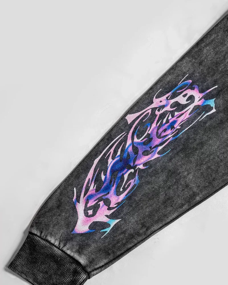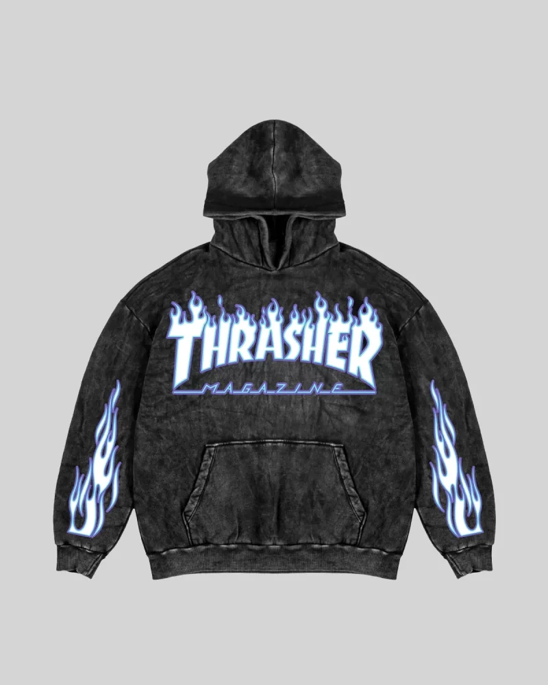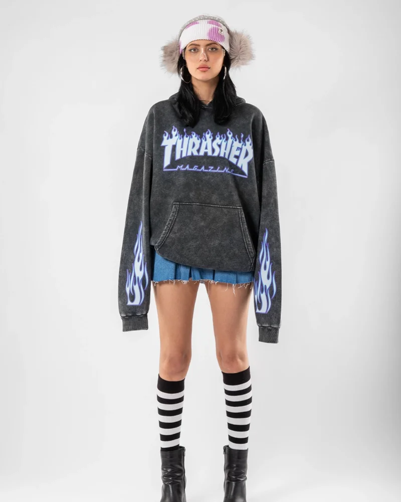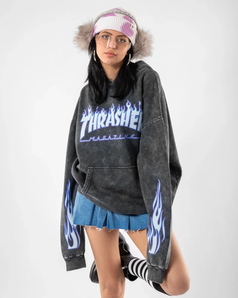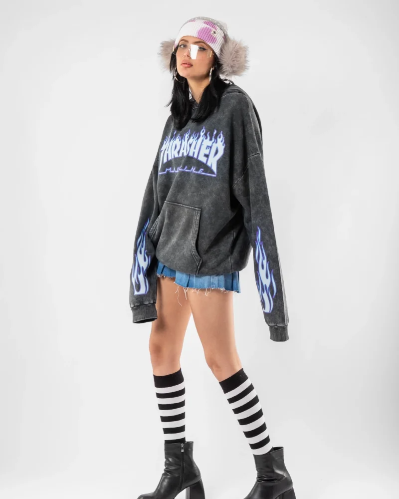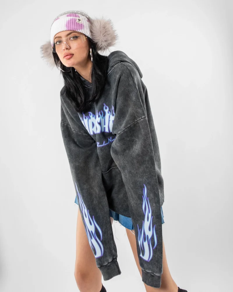 Yıkamalı Thrasher Flam Baskılı Oversize Unisex Füme Hoodie