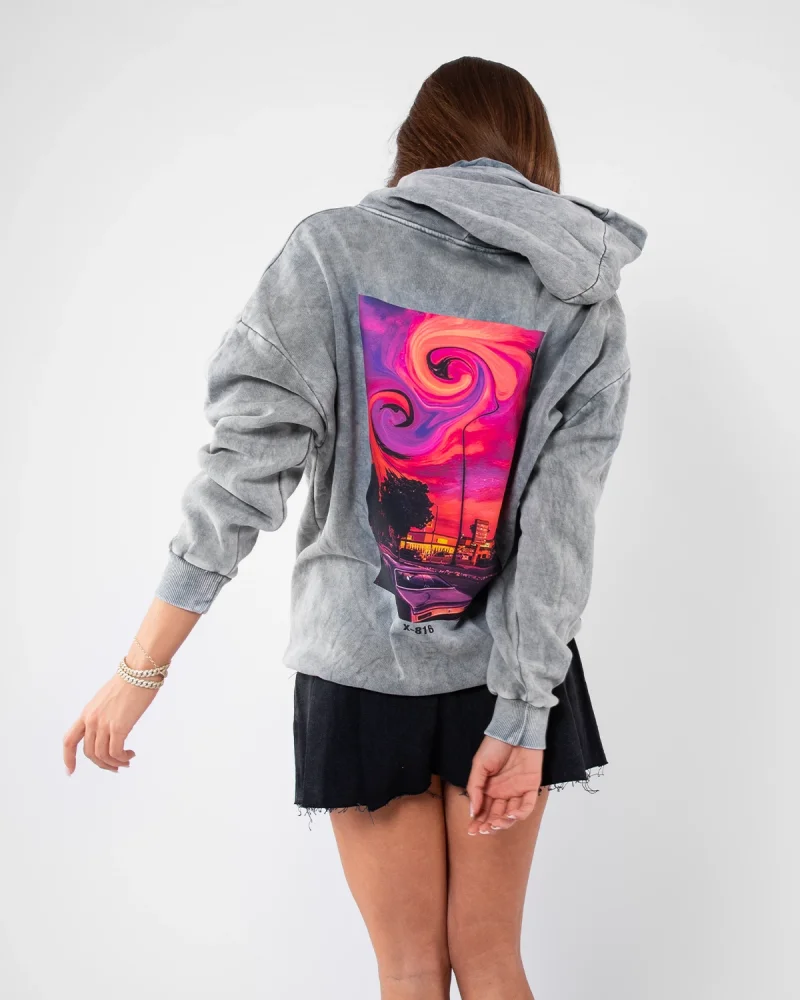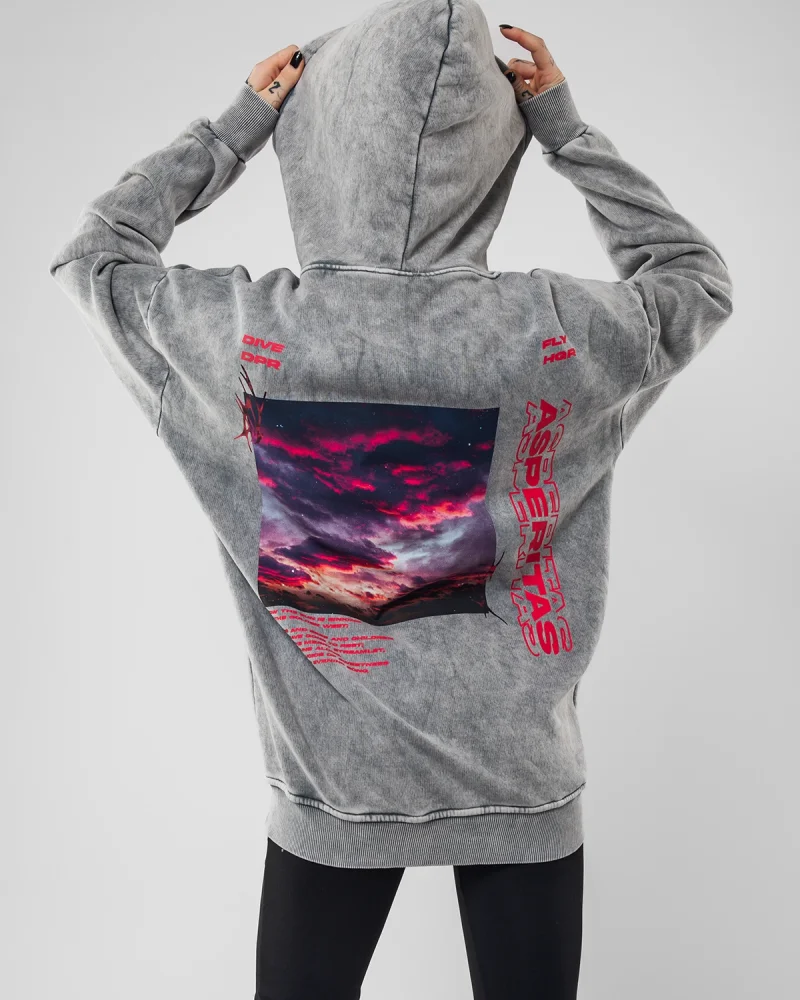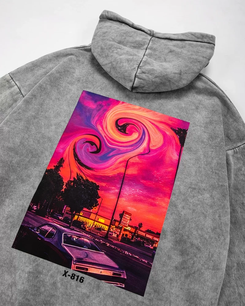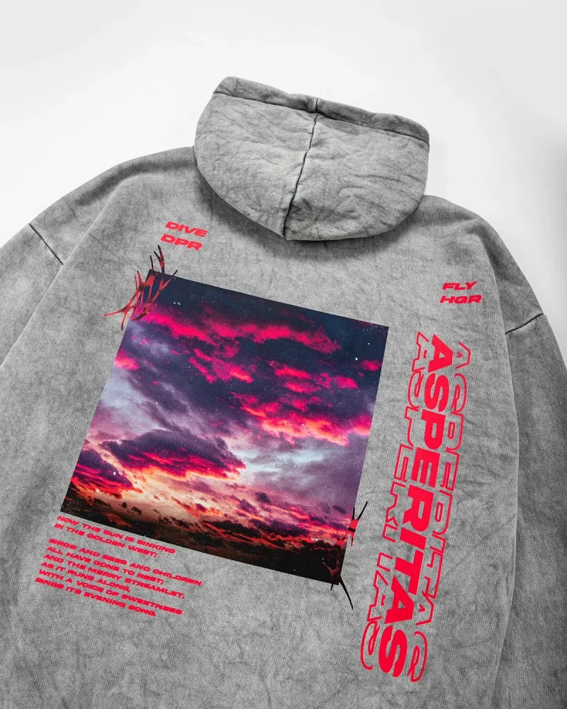 Yıkamalı Beyaz Kırmızı Dusk Baskılı Oversize Unisex Hoodie
