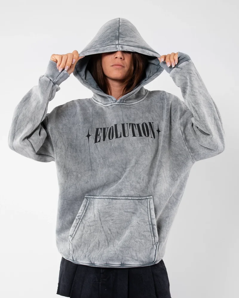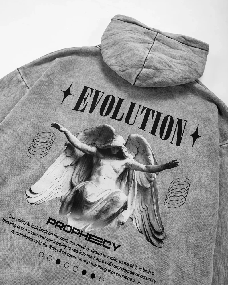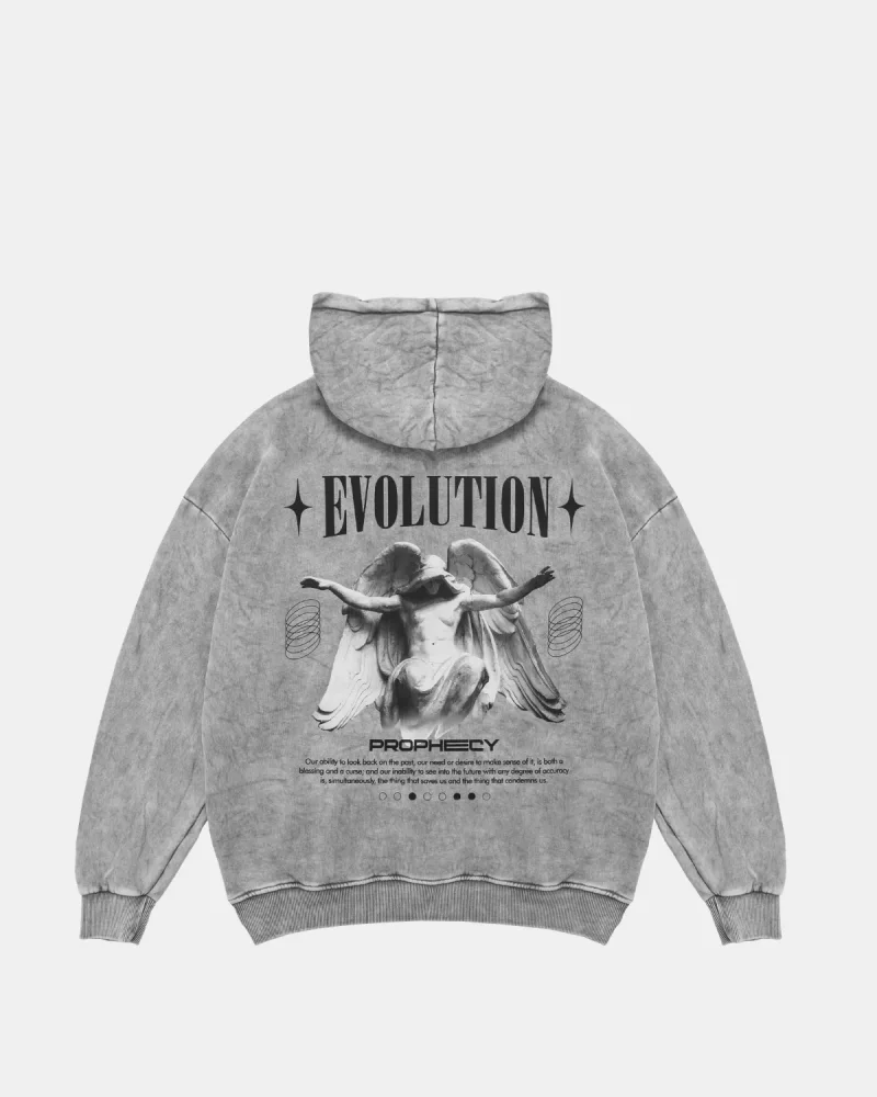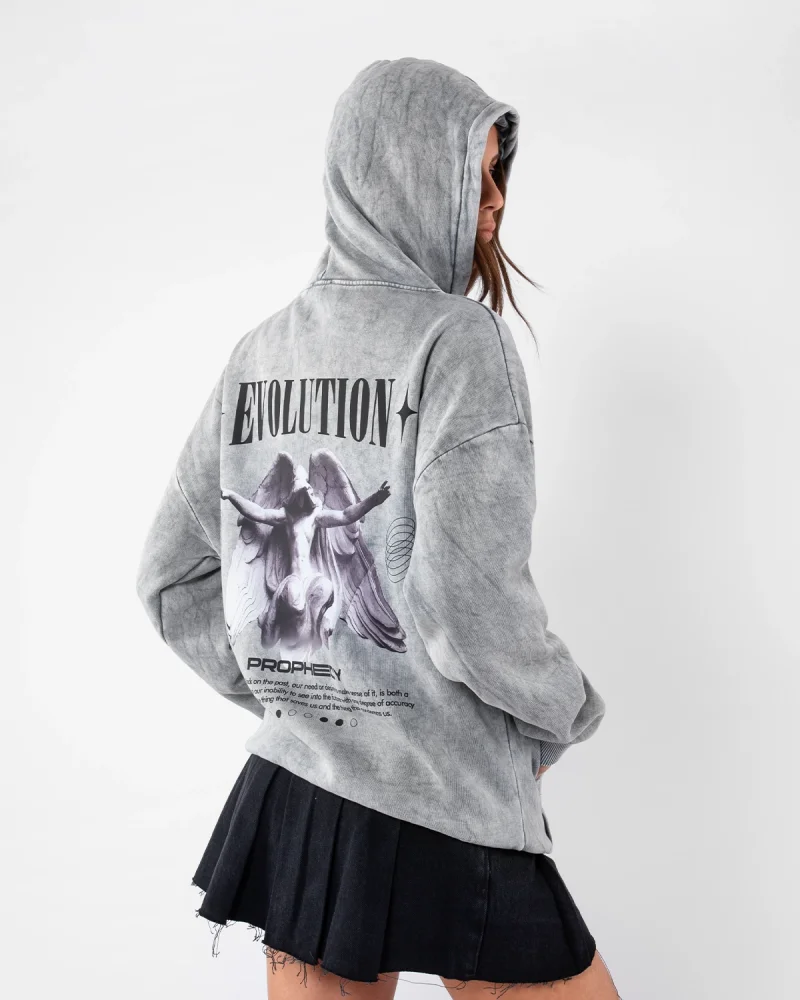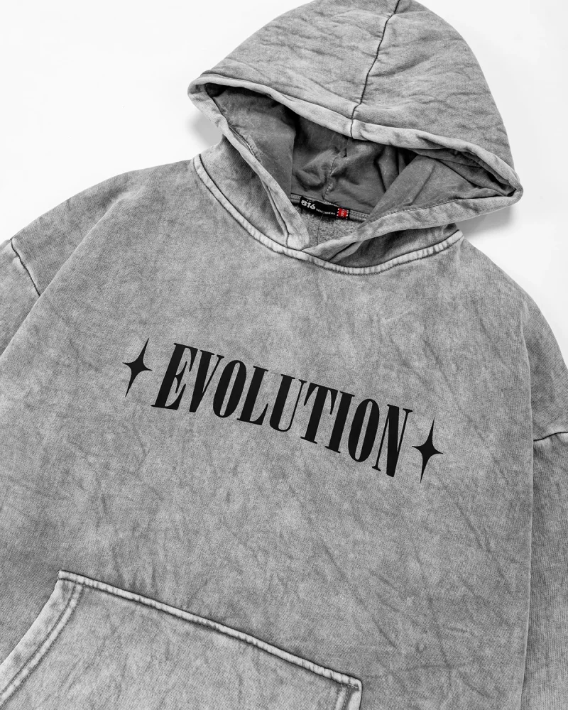 Yıkamalı Beyaz Evolution Baskılı Oversize Unisex Kapüşonlu Hoodie