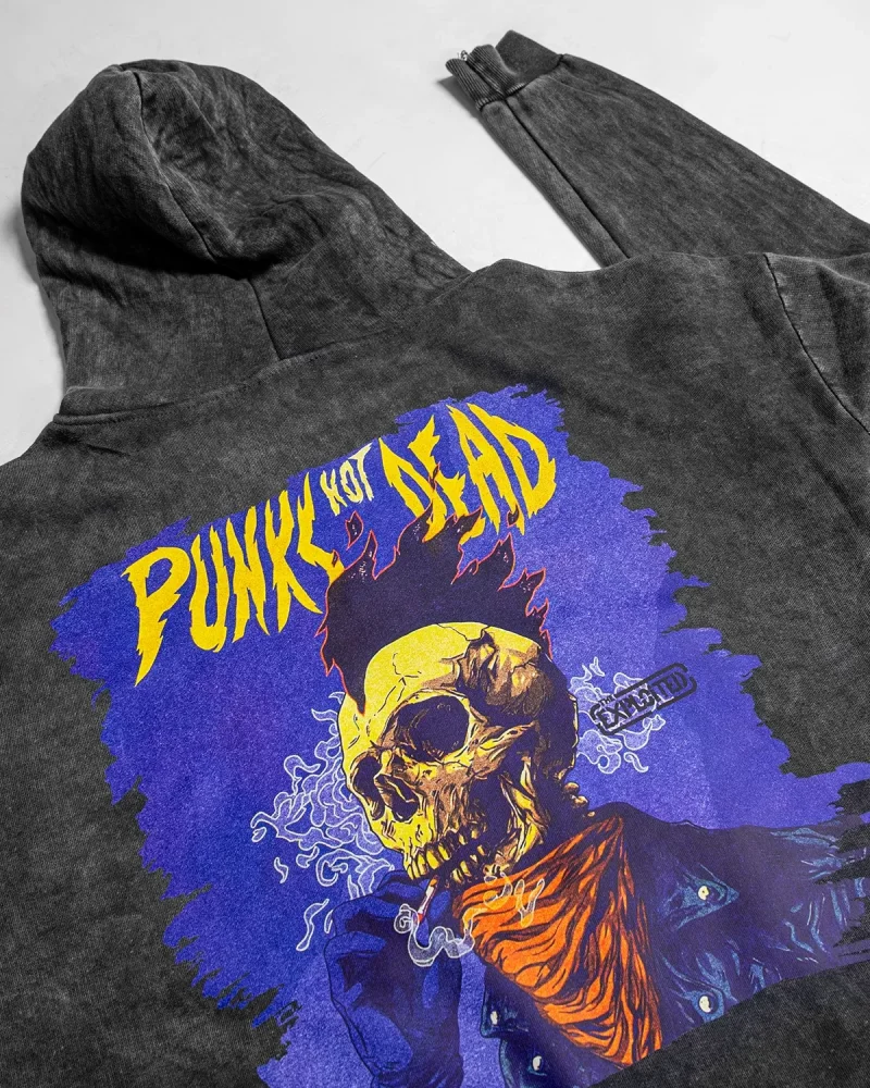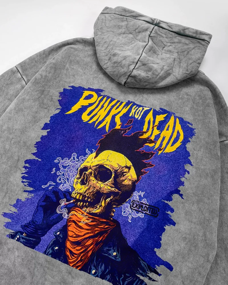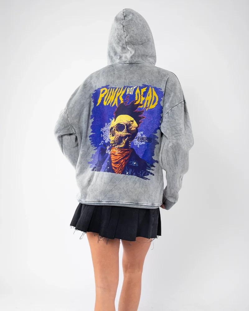 Yıkamalı Beyaz Punks Not Dead Baskılı Oversize Unisex Hoodie