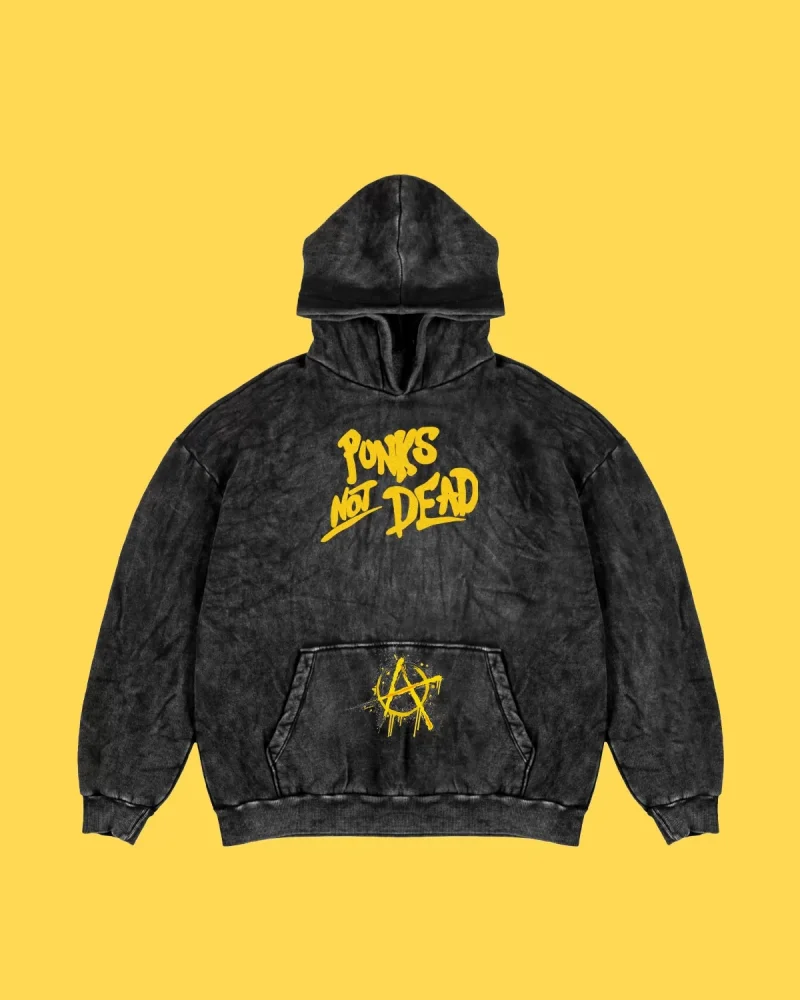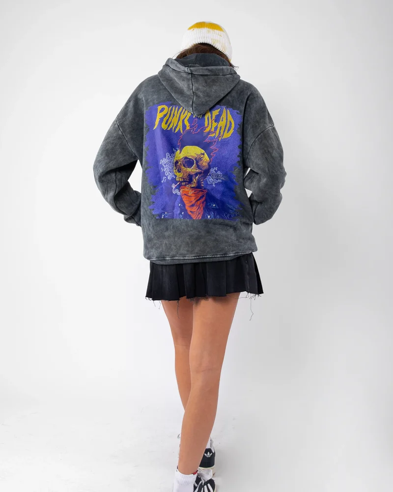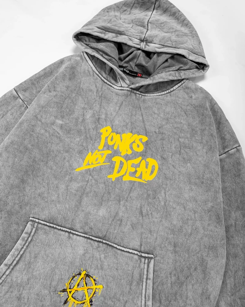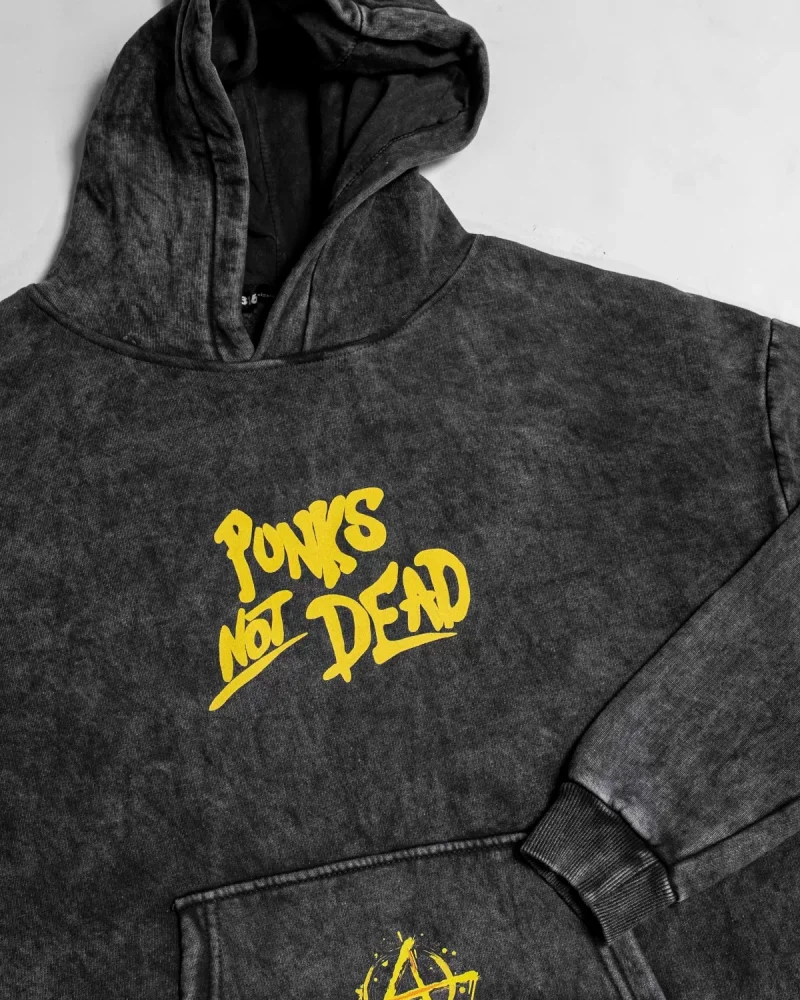 Yıkamalı Punks Not Dead Baskılı Oversize Unisex Siyah Hoodie