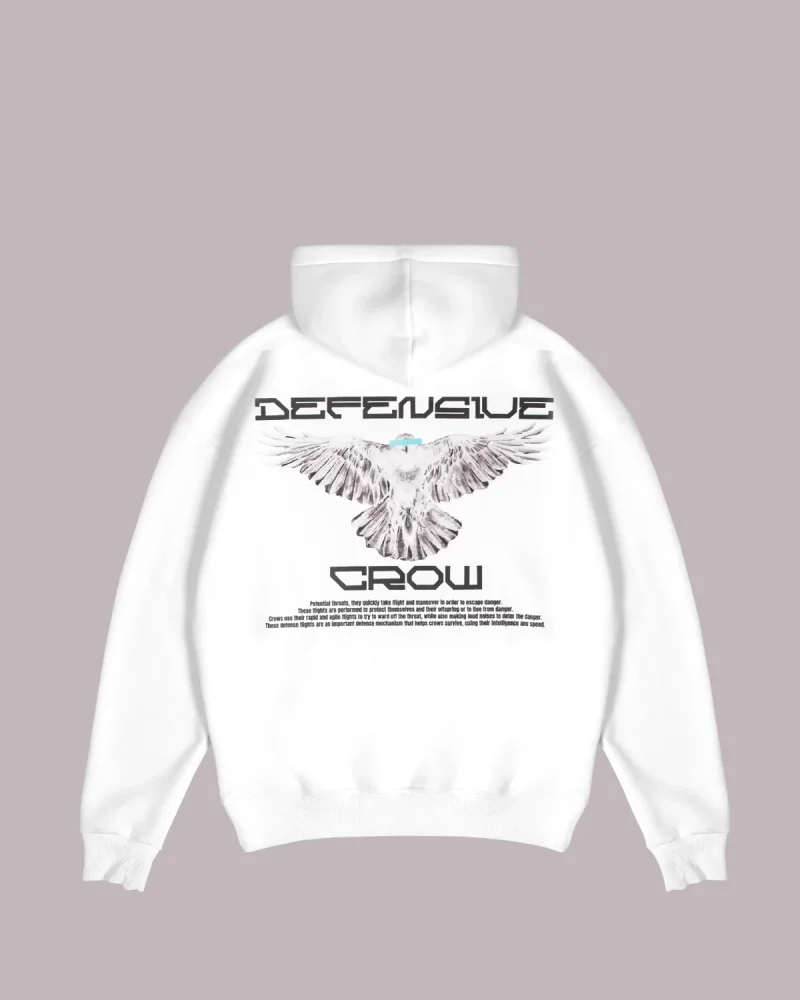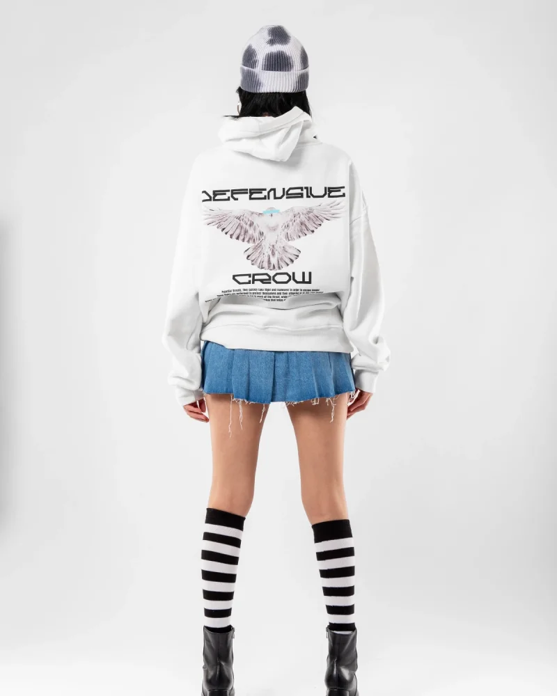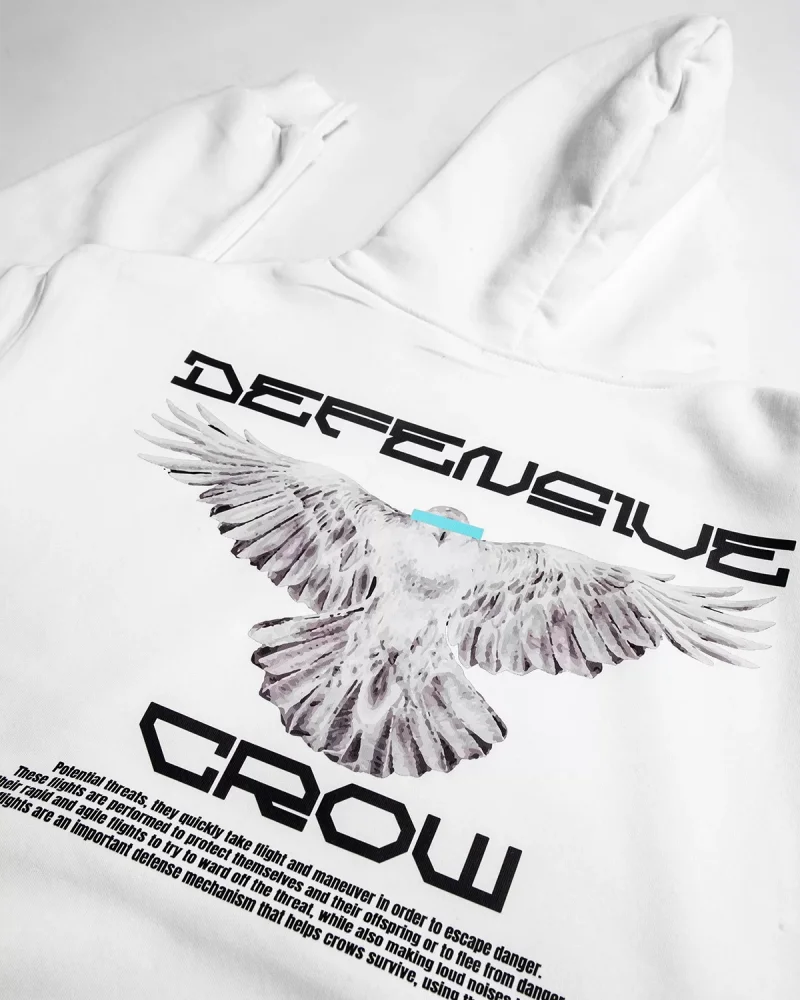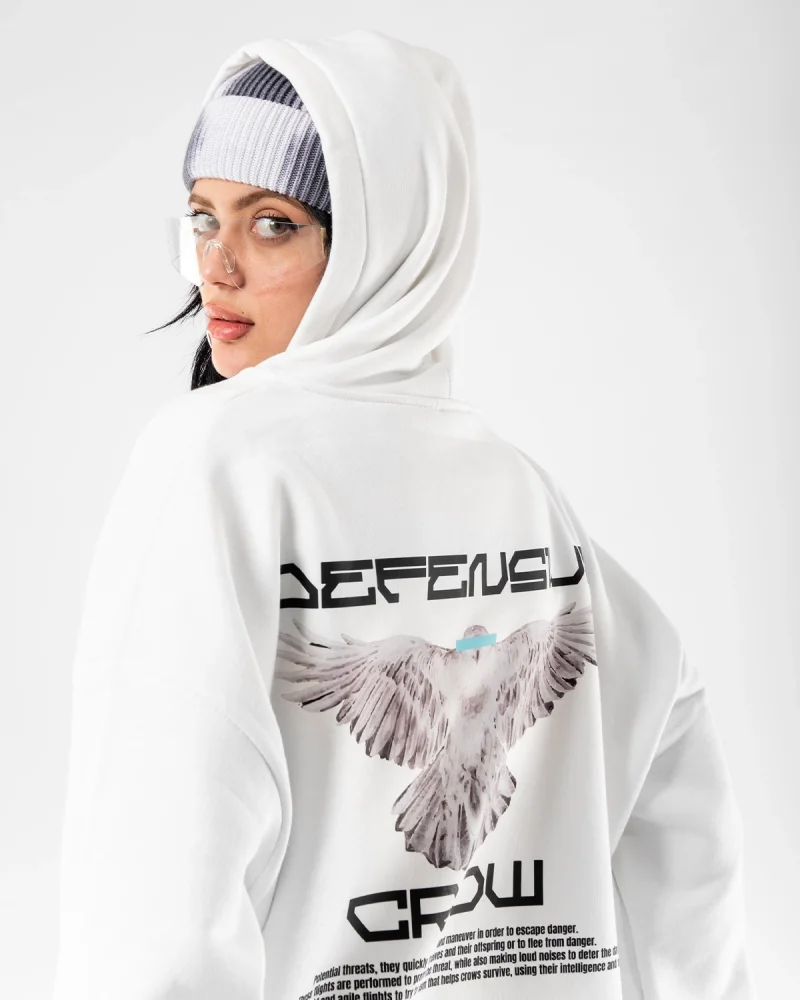 Defensive Crow Baskılı Oversize Unisex Beyaz Hoodie