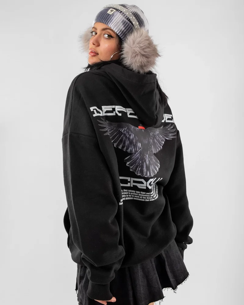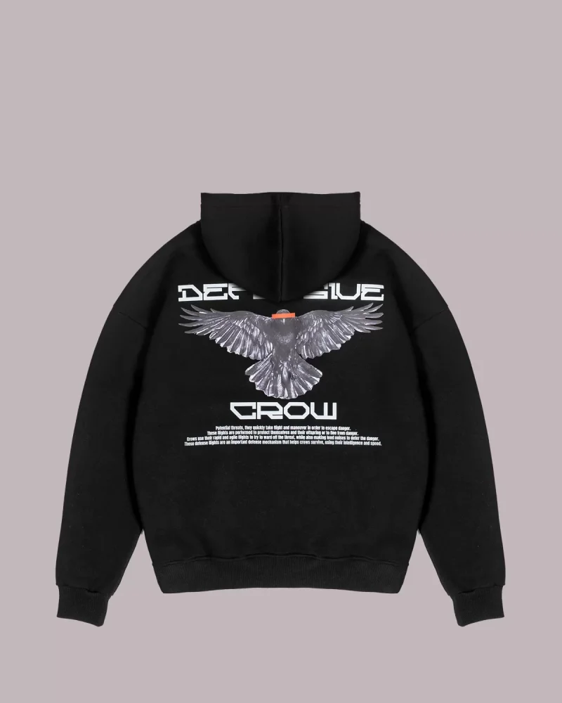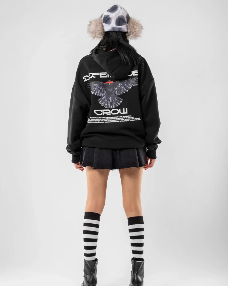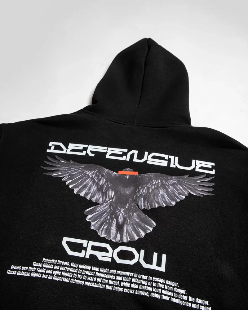 Defensive Crow Baskılı Oversize Unisex Siyah Hoodie