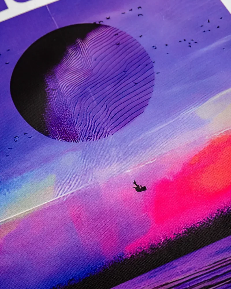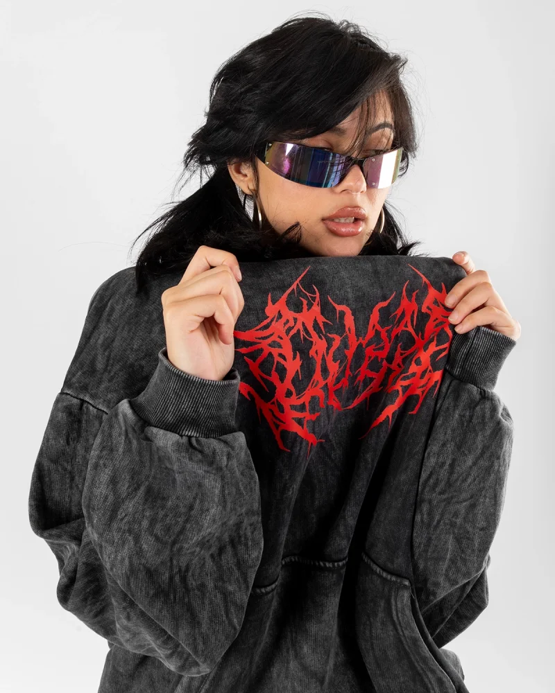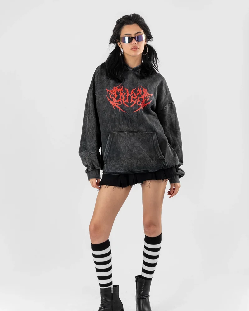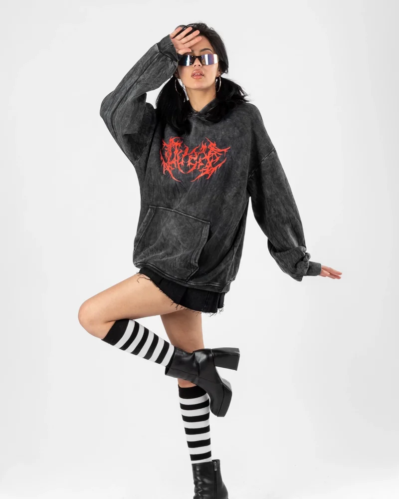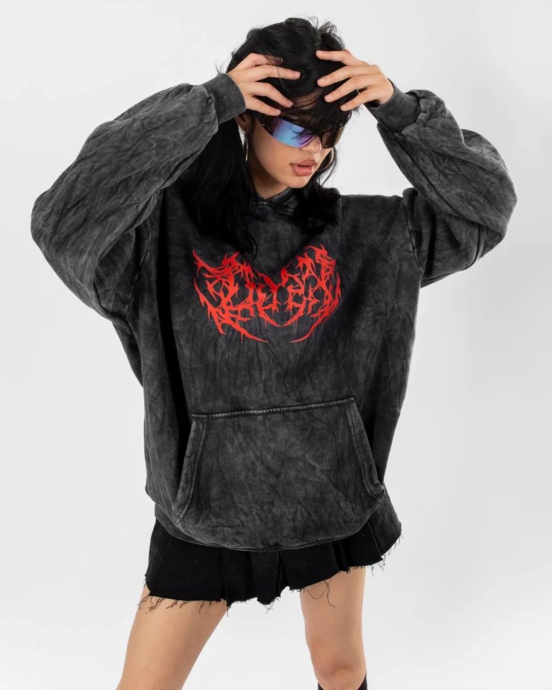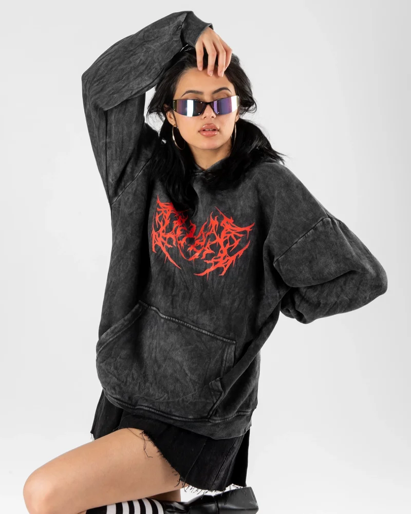 Yıkamalı Kırmızı Dusk Baskılı Oversize Unisex Siyah Hoodie