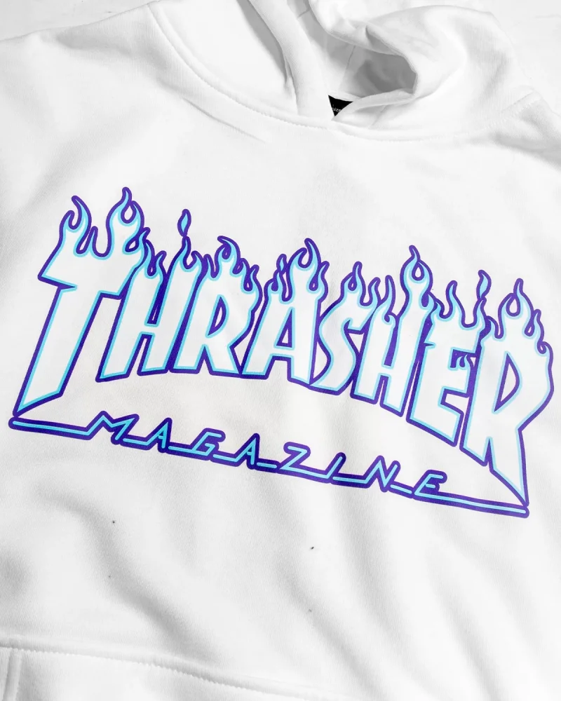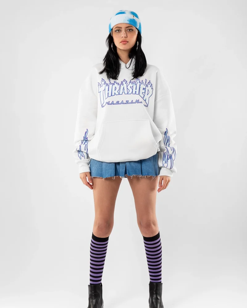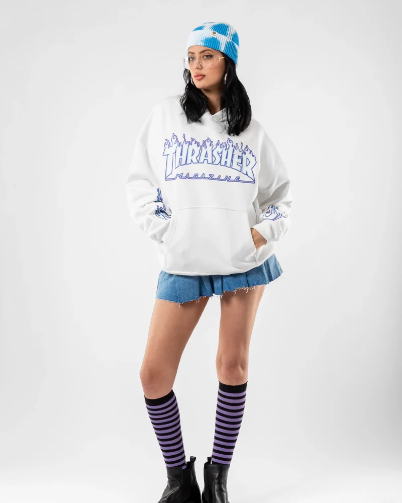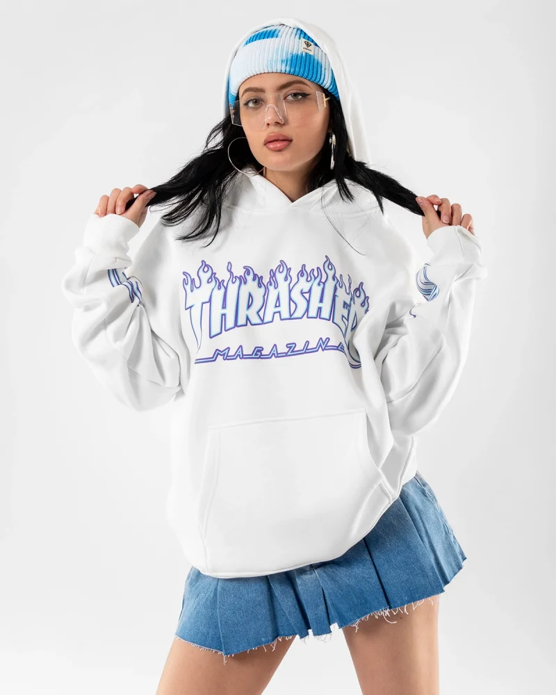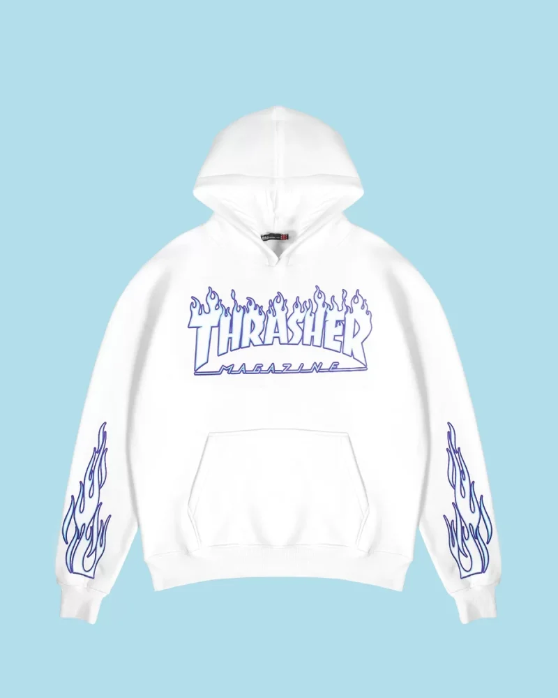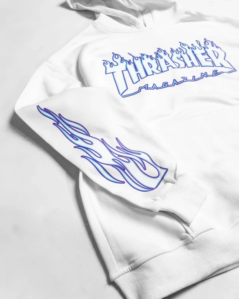 Thrasher Flam Baskılı Oversize Unisex Beyaz Hoodie