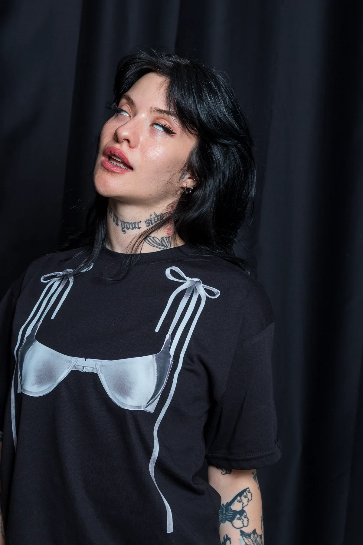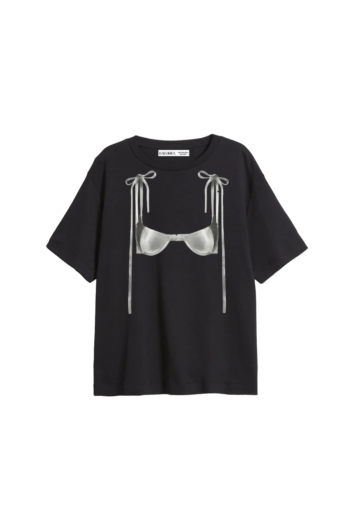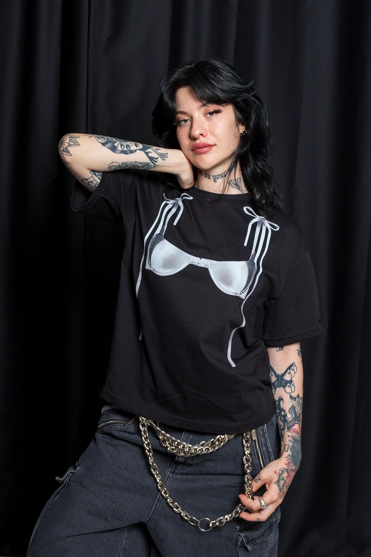 Ribbon Bikini Baskılı Relaxed Fit Siyah Kadın Tshirt, Bak Moda'nın kendine özgü tasarımı ile stilinizi tamamlayacak mükemmel bir seçenektir.