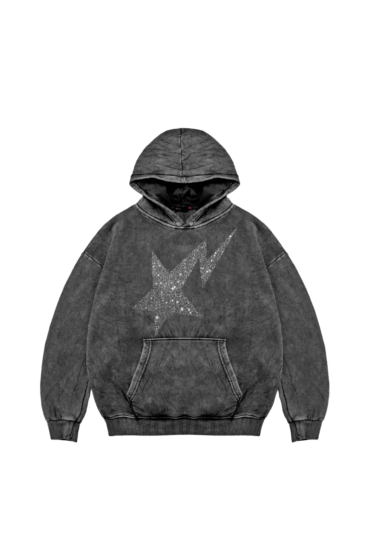 SHİNİNG STAR BEYAZ BASKILI OVERSİZE UNİSEX PREMİUM YIKAMALI SİYAH HOODİE