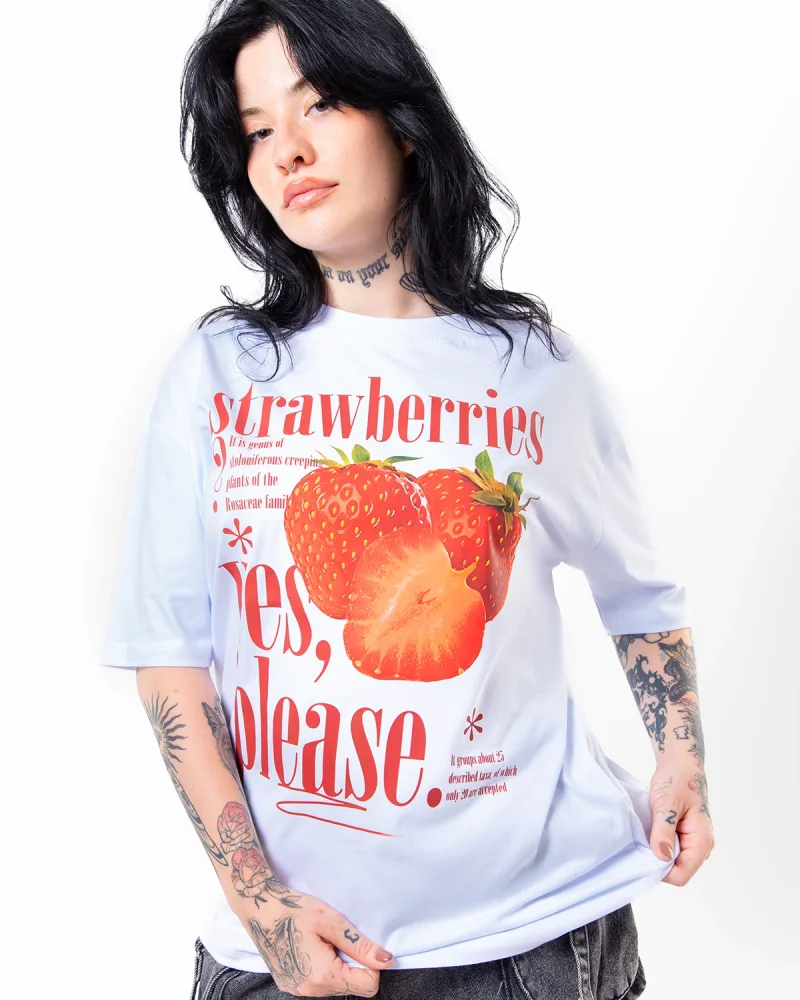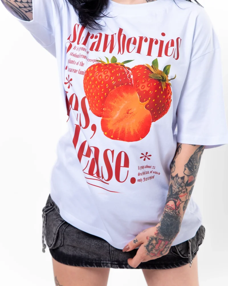 Strawberries Yes Please Baskılı Oversize Unisex Beyaz Tshirt
