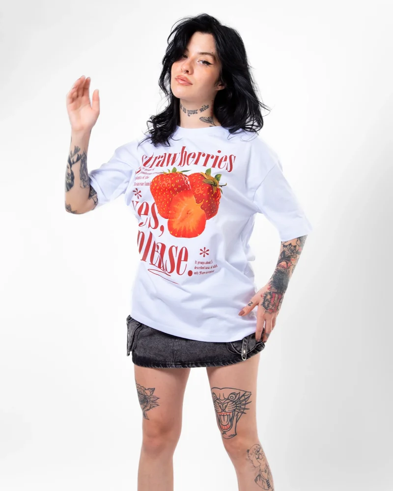 Strawberries Yes Please Baskılı Oversize Unisex Yıkamalı Beyaz Tshirt