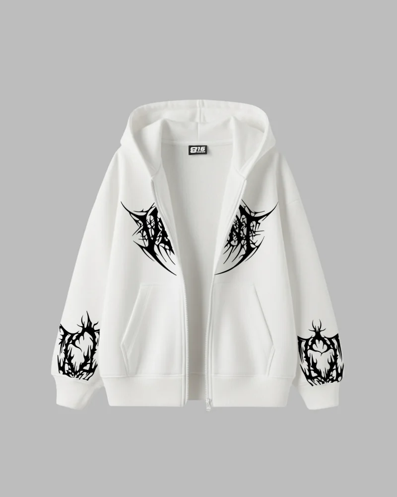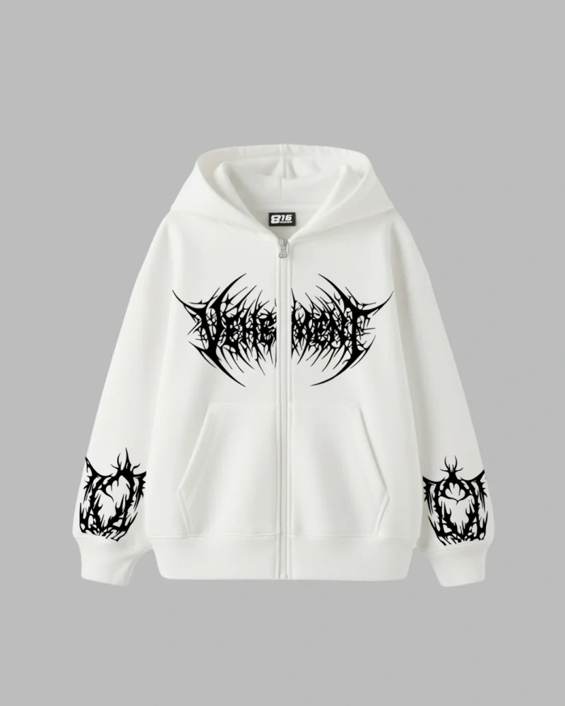 Vehement Baskılı Fermuarlı Kapüşonlu Zip Unisex Beyaz Sweatshirt