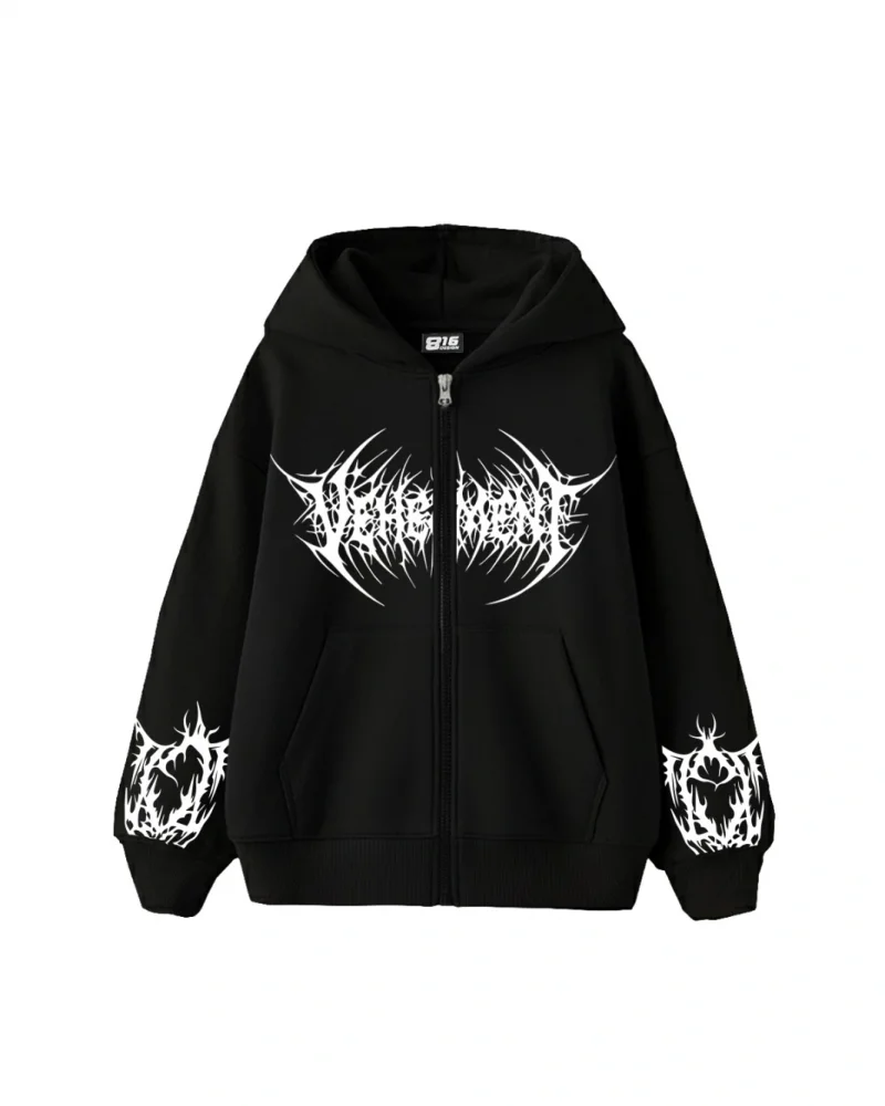 Vehement Baskılı Fermuarlı Kapüşonlu Zip Unisex Siyah Sweatshirt