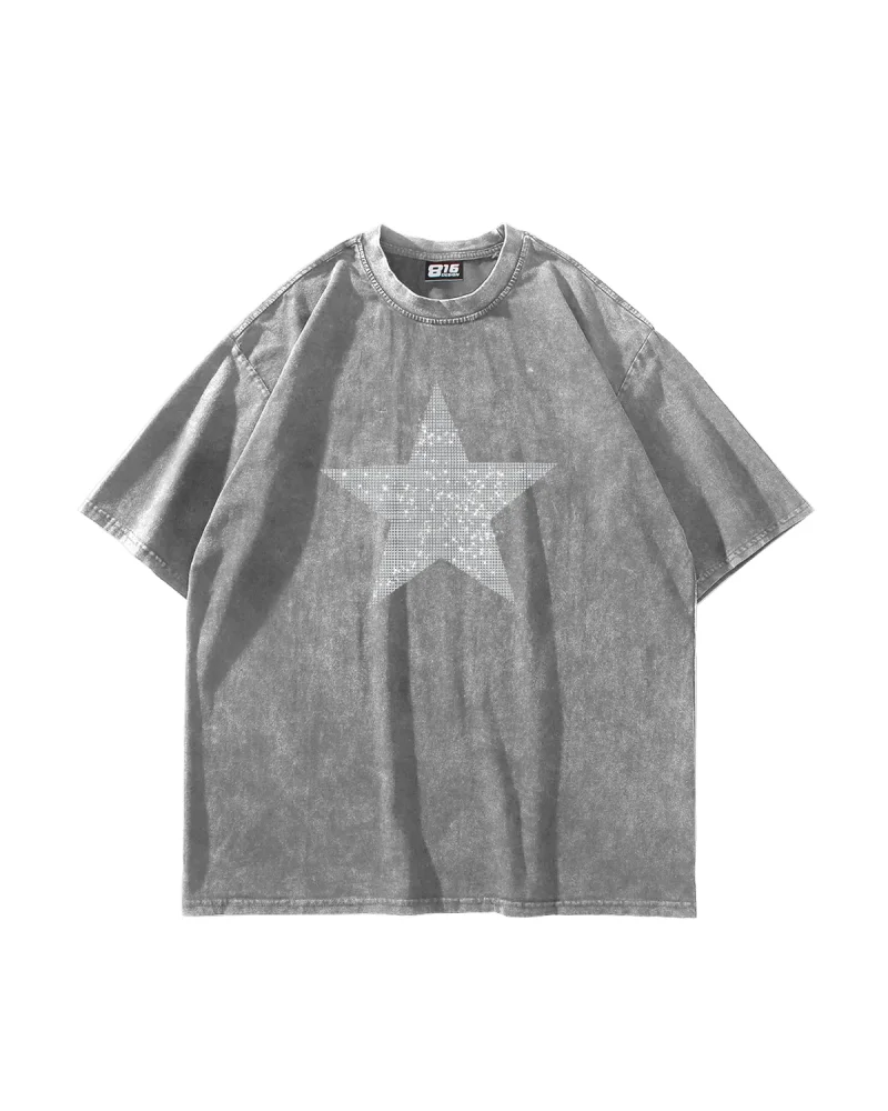 Yıldız Taş Baskılı Oversize Unisex Yıkamalı Siyah Tshirt