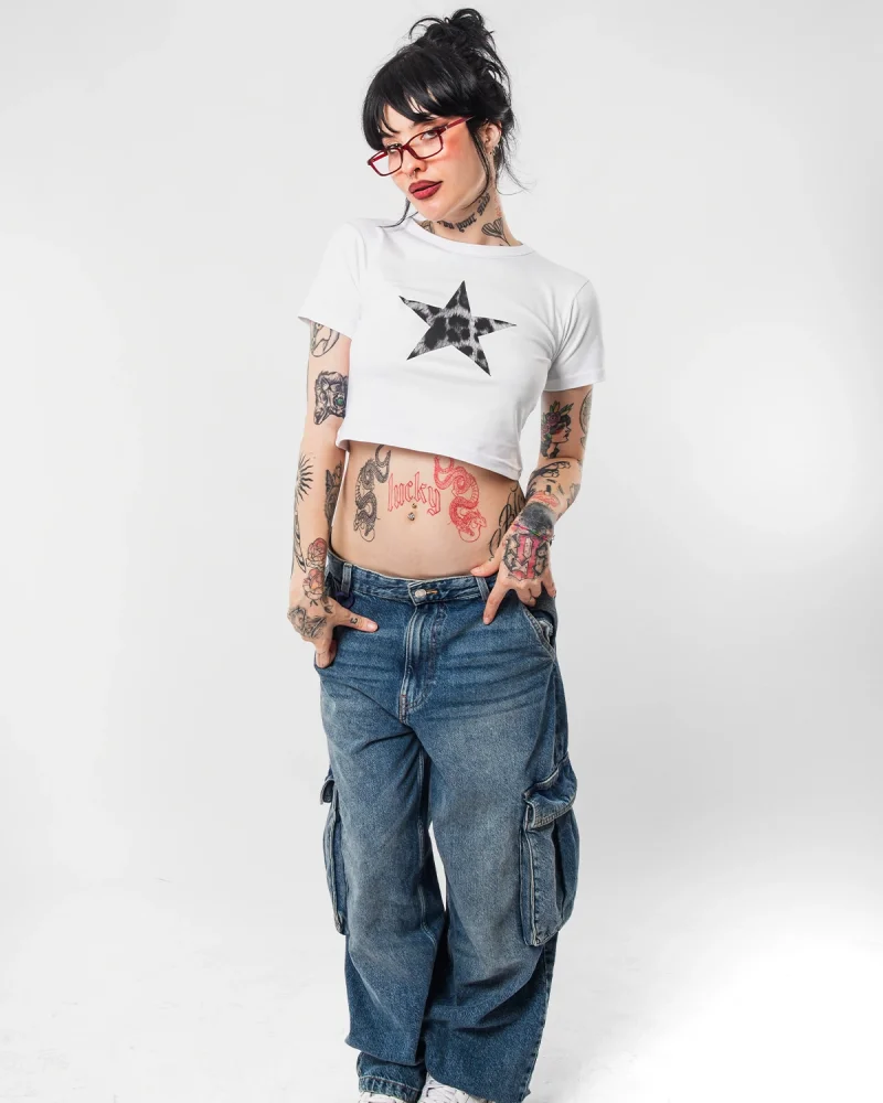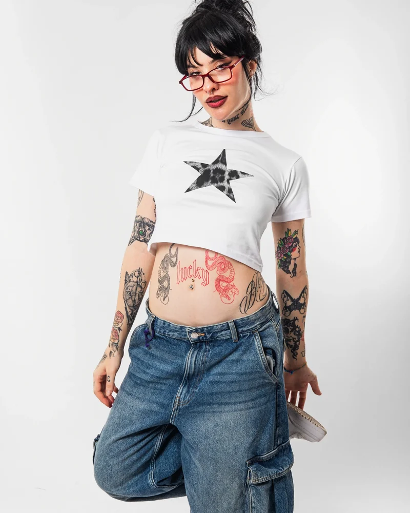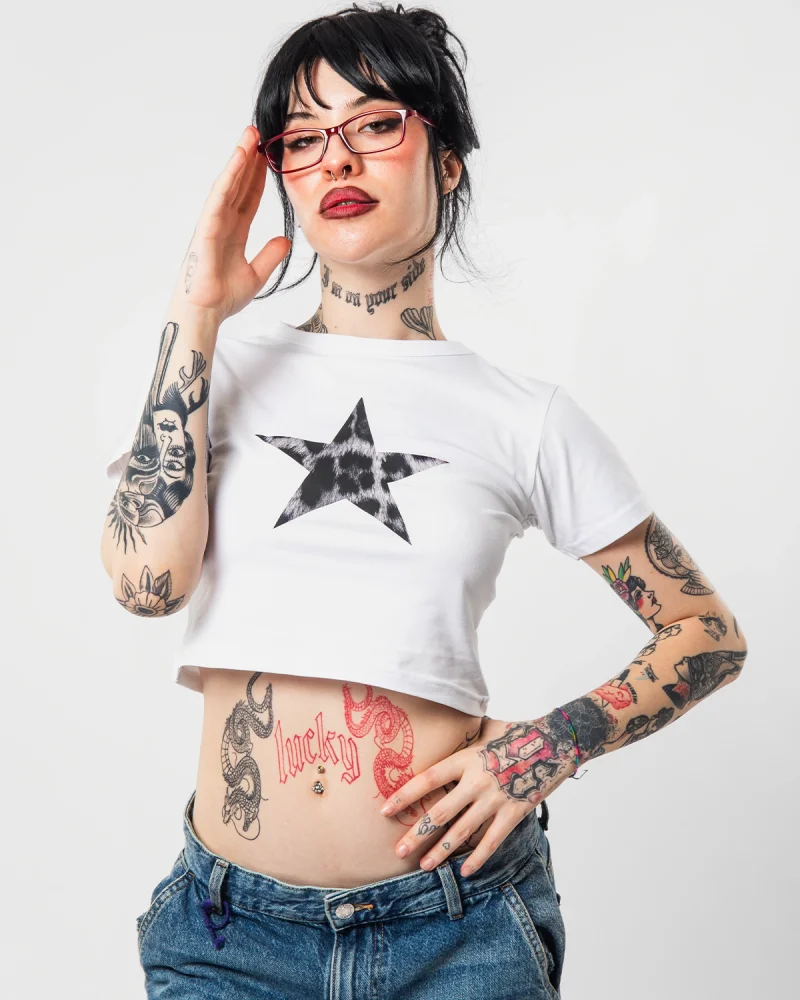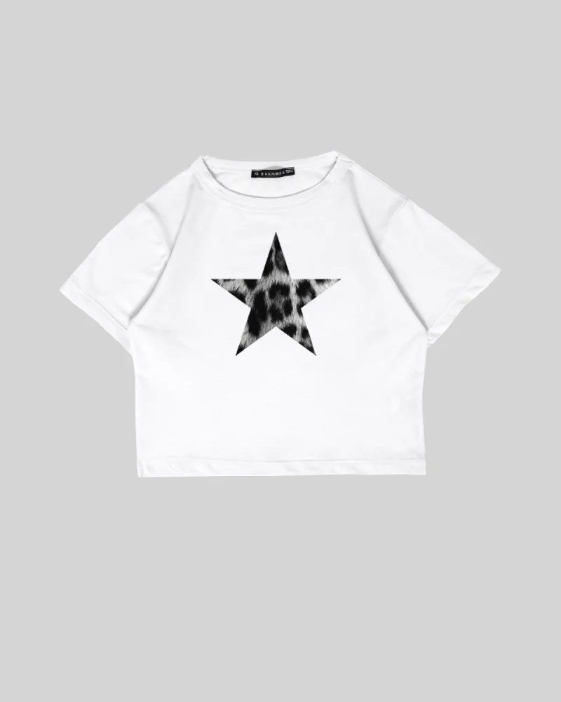 "V2" Leopar Star Baskılı Beyaz Crop Top