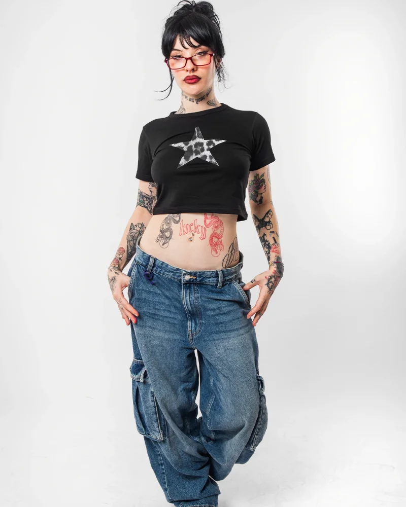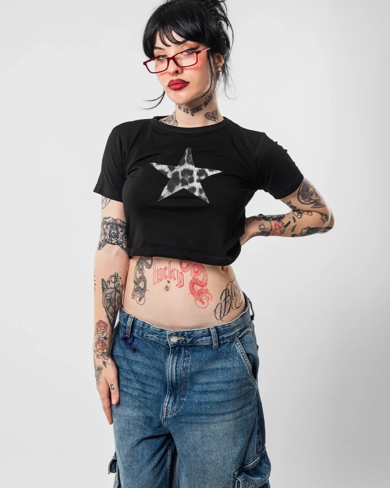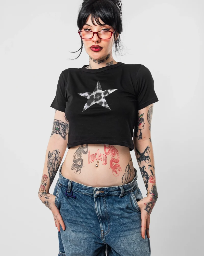 "V2" Leopar Star Baskılı Siyah Crop Top